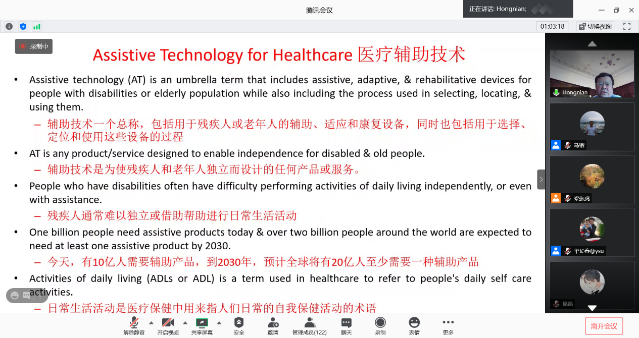于洪年教授首先介绍了工业革命影响和人口老龄化所面临的挑战,随后介绍了医疗健康辅助技术以及国外在这一领域的研究成果,并对自适应机器人,特别是HPCPS(Human Adaptive CPS)的概念和方法进行论述,解读当前机器人的研究前沿方向和应用问题。于教授的报告特别讲述了机器人的辅助技术在应对新型冠状病毒(COVID-19)疫情危机的应用前景。于教授的报告内容丰富、全面系统,使大家了解到医疗健康辅助技术的研究理论与最新成果。