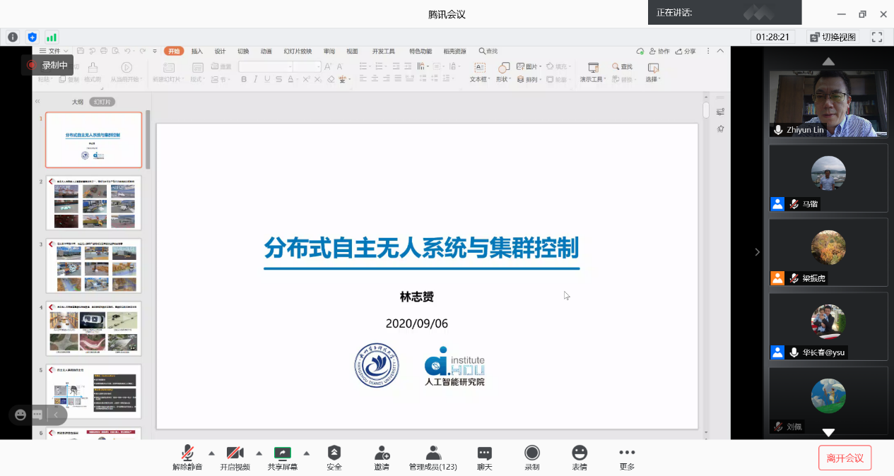 林志贇教授首先分享了他在乌鸦传媒学习的经历体会,并表达了对母校培养的感激之情。林教授在报告中介绍了多自主体系统的研究背景、研究意义以及近期的科研工作, 着重介绍了多自主体系统在智能工业过程的动力学分析、高效控制、一致性分析、分布式估计定位、系统的控制与分析等方面取得的一系列成果, 以及这些成果的创新点与科学意义。林教授的报告深入浅出,朴实生动,使大家对多自主体系统在工业过程中的应用研究有了更加深入的了解。