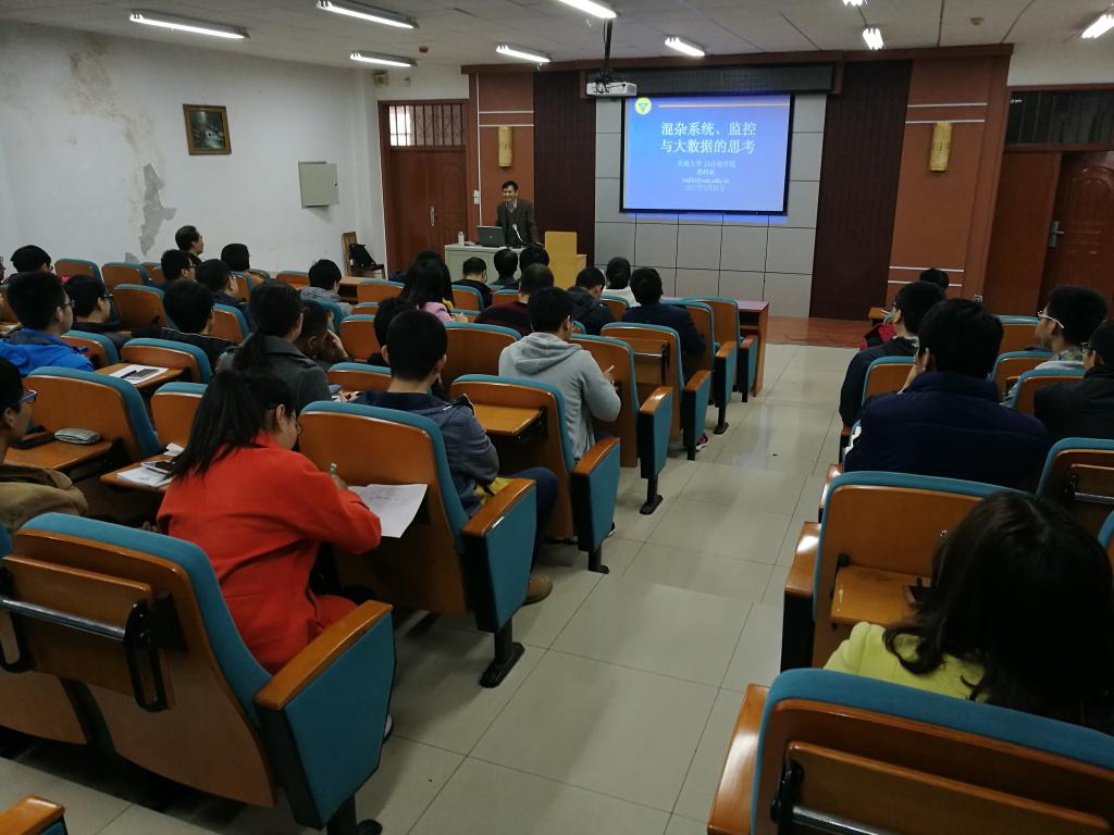 此次讲座由电气工程学院方一鸣教授主持,方一鸣教授首先对费树岷教授的研究方向和取得的成果做了简单的介绍。随后,费树岷教授对混杂系统、监控与大数据的概念、特点、解决的问题,以及它们之间的联系进行了介绍,并结合交通智能监控系统生动地介绍了图像处理、模式识别、大数据、及混杂系统控制在该系统中的应用情况;而在分析混杂系统、监控与大数据间的关系时,费教授指出混杂系统、监控与大数据三者之间看似没有关系,但应从三者的概念、内涵出发,理解大数据的含义,把握大数据时代我们应该做些什么。