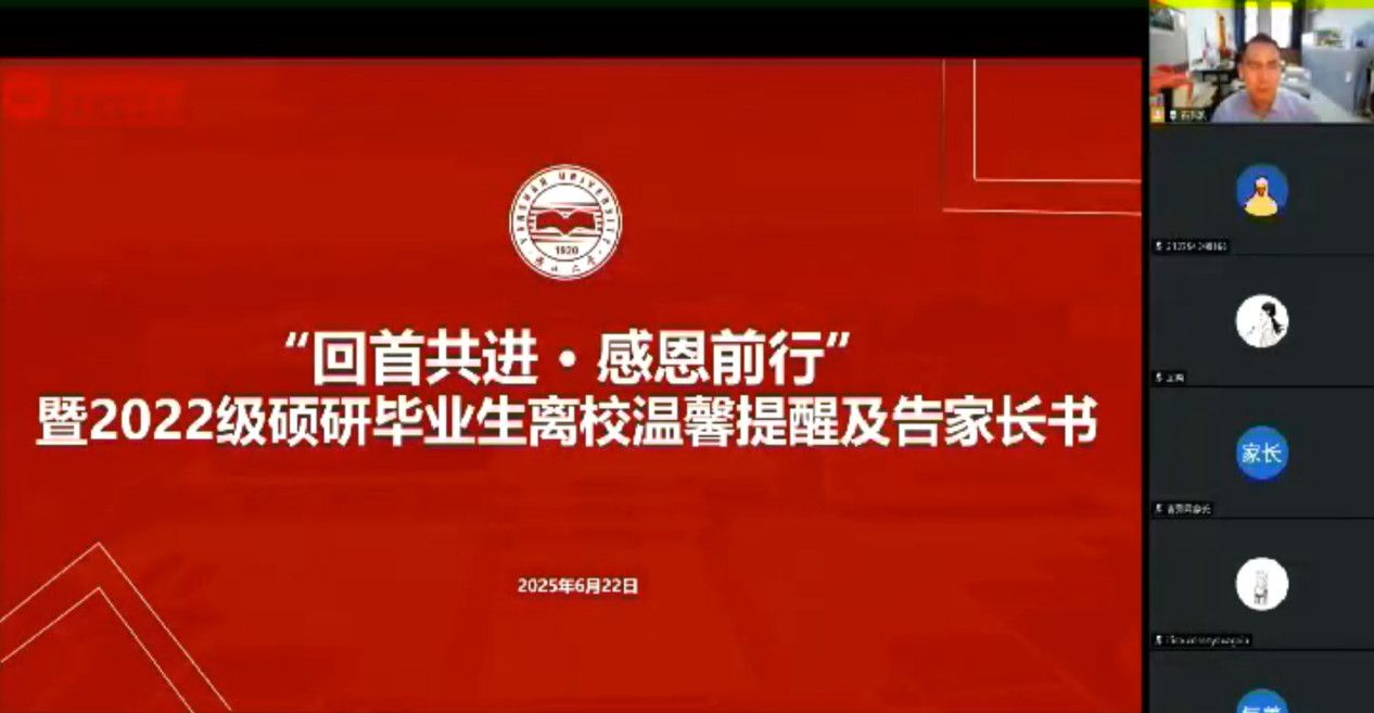 毕业典礼结束后,毕业班辅导员在线上以“最后一场家长会”的形式,与全体学生家长一起对毕业研究生在校的成长历程进行了深情回顾,并嘱托家长调整心态,注意方法指导,期望未来继续通过家校合作,共同努力,护航学生在新的岗位上创造美好未来。