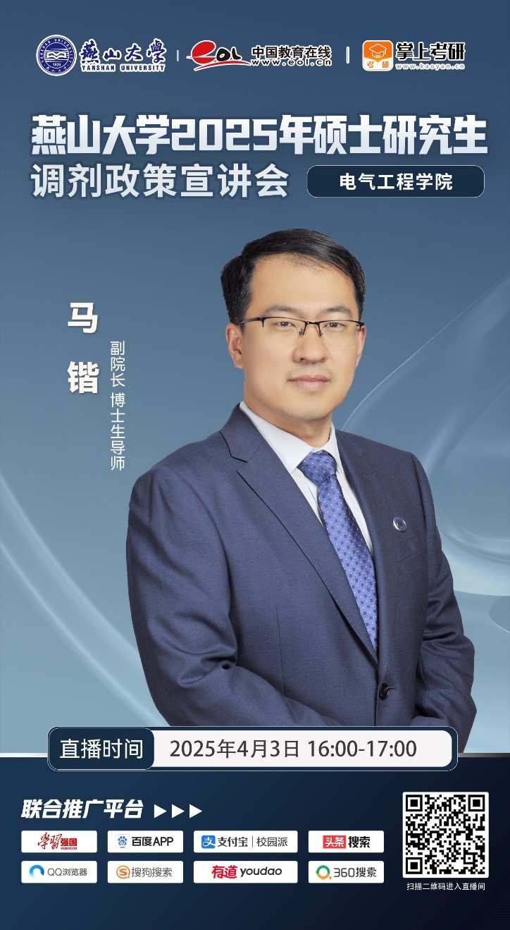 2025年4月3日(周四)16:00-17:00,电气工程学院将举办2025年硕士研究生调剂政策直播宣讲会。学院副院长马锴和各学科负责人将在直播间与广大考生进行面对面交流,在线解读调剂政策和各学科优势,并实时解答考生疑问,欢迎有意向调剂我院各专业的考生参与交流。